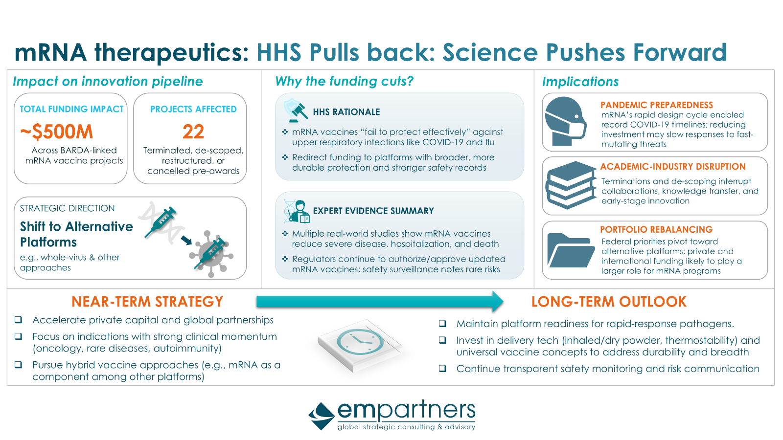 In August 2025, the U.S. Department of Health and Human Services (HHS) announced the termination and restructuring of 22 federally funded mRNA vaccine and therapeutic projects, totaling nearly $500 million under the Biomedical Advanced Research and Development Authority (BARDA). This marks a significant strategic shift away from mRNA platforms toward alternative vaccine technologies, which HHS indicated may offer broader or more durable protection against certain viral threats.